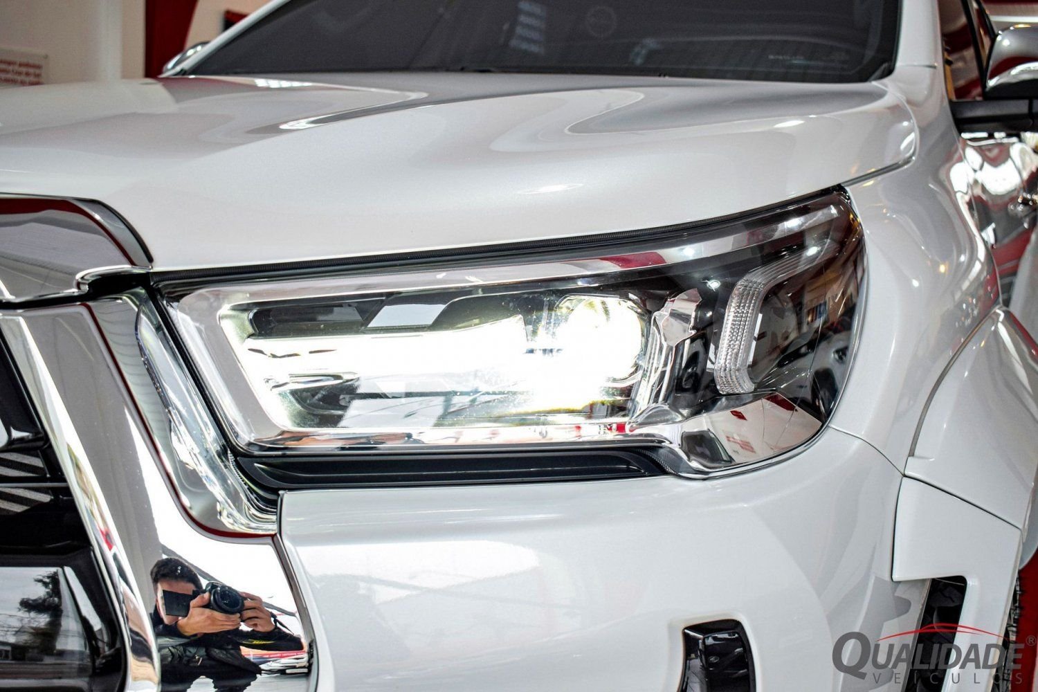 HILUX SRX PLUS 2.8 DIESEL AT 4X4 2024 na cor Branco Lunar Perolizado, de único dono, com apenas 15.077km, revisada em concessionária, sem retoques de pintura, em estado de nova.